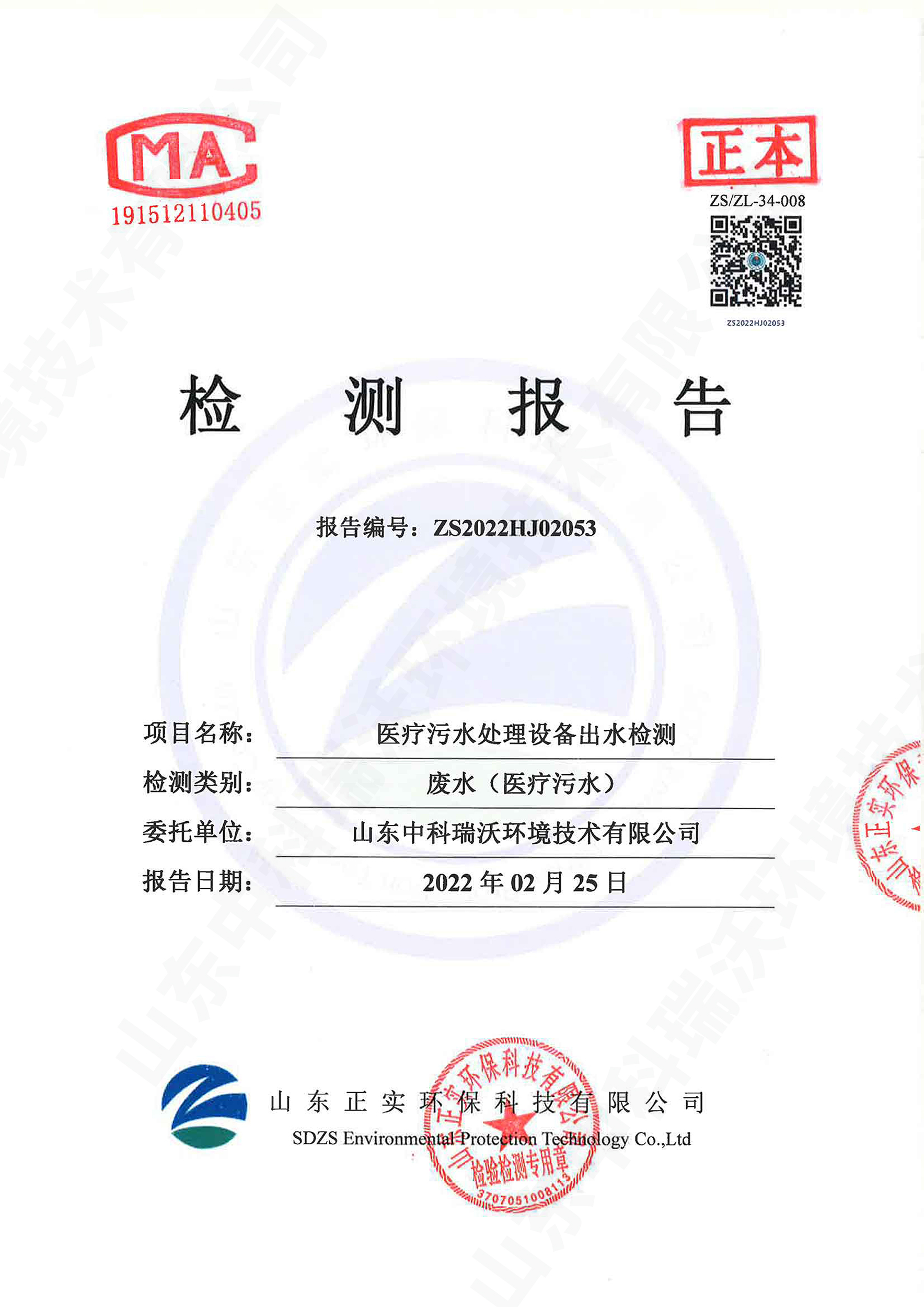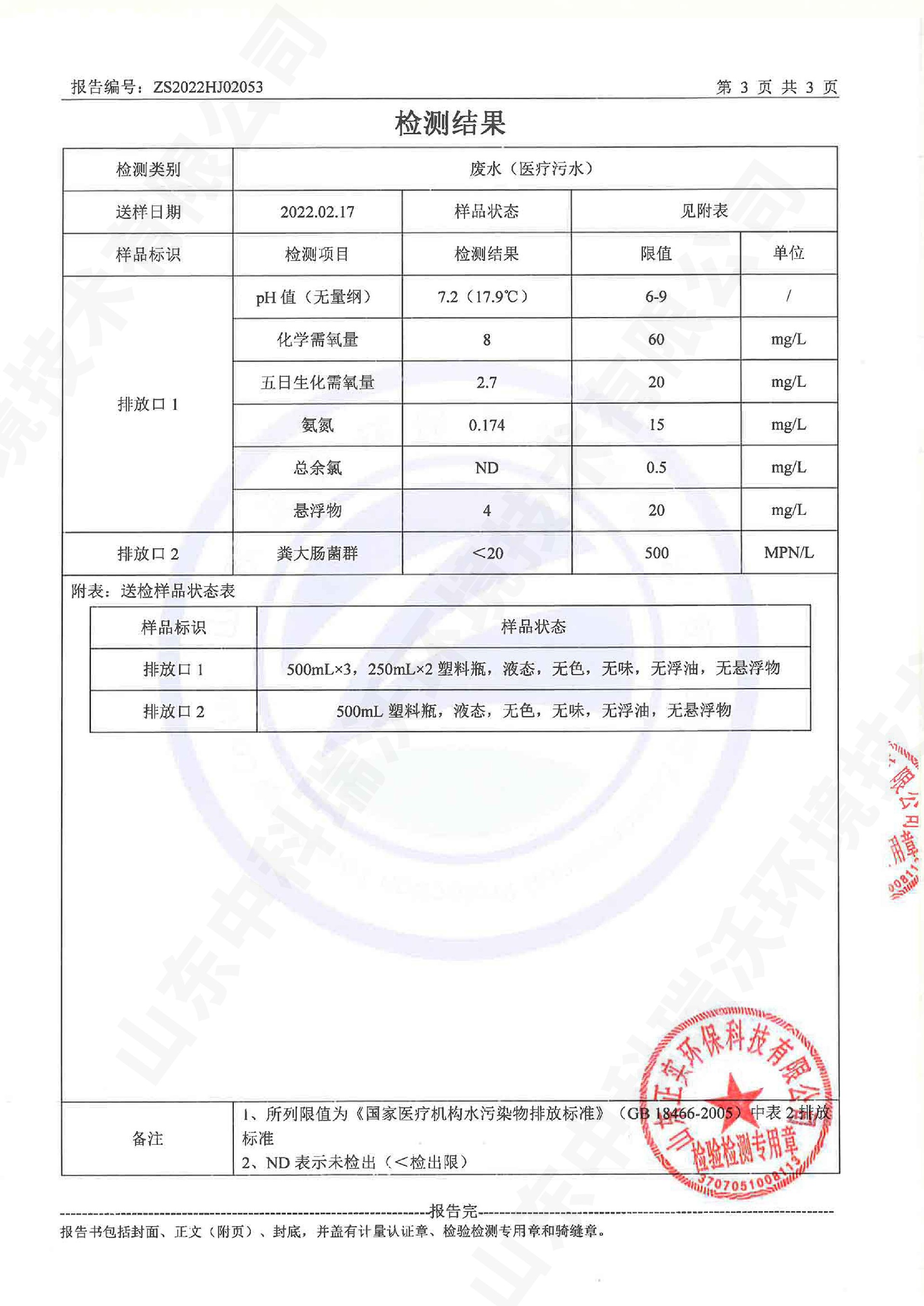 醫(yī)療污水處理設(shè)備出水檢測報(bào)告