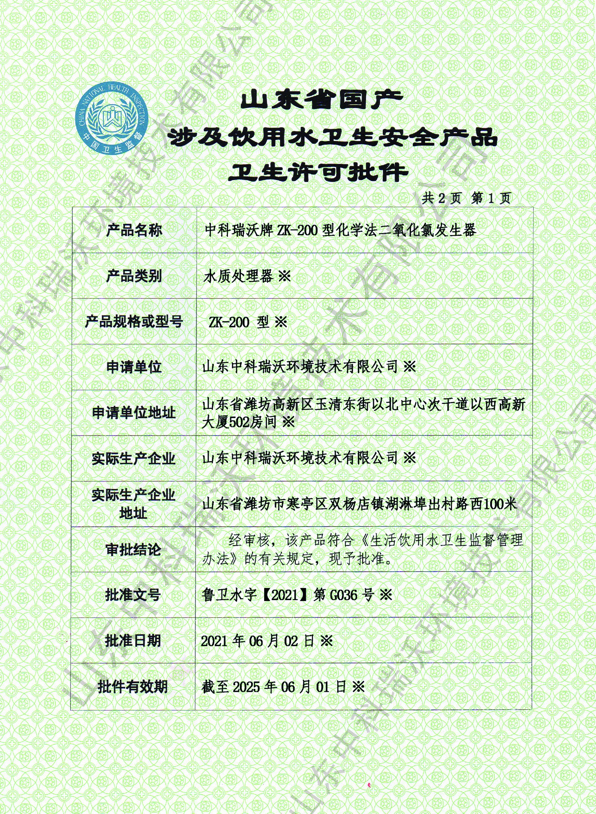 二氧化氯衛生許可批件